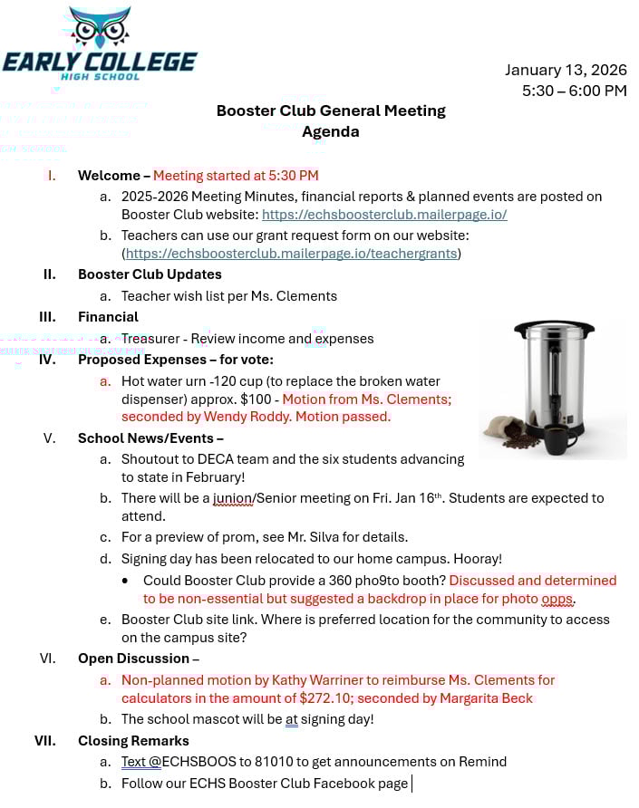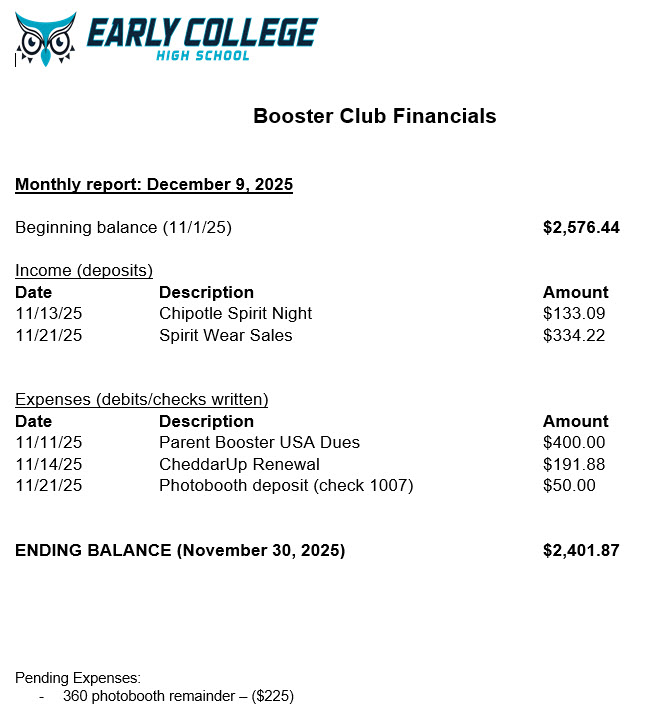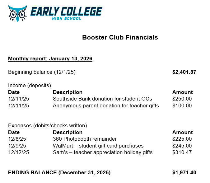 The Booster Club, similar to a PTA, provides support for Early College High School teachers and students through fundraising and volunteering.
